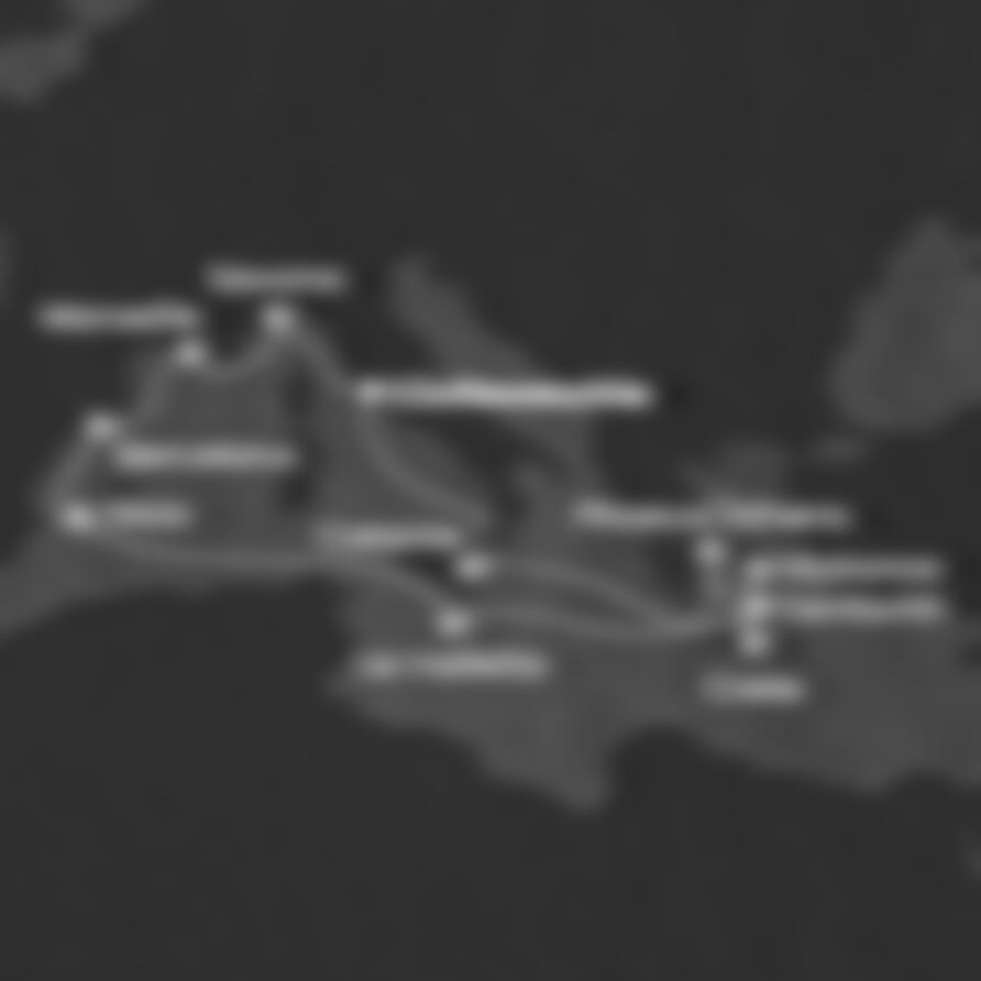 Civitavecchia Rome - Catania (Itálie) - Pireus/Atény (Řecko) - Heraklion/Kréta (Řecko) - Mykonos (Řecko) - Santorini (Řecko) - La Valletta (Malta) - Ibiza (Španělsko) - Barcelona (Španělsko) - Marseille (Francie) - Savona (Itálie) - Civitavecchia Rome.